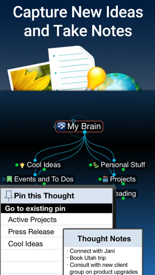 • Go from ideas to action by capturing all your goals and then adding even more connected Thoughts and all the right information to achieve and get things done.