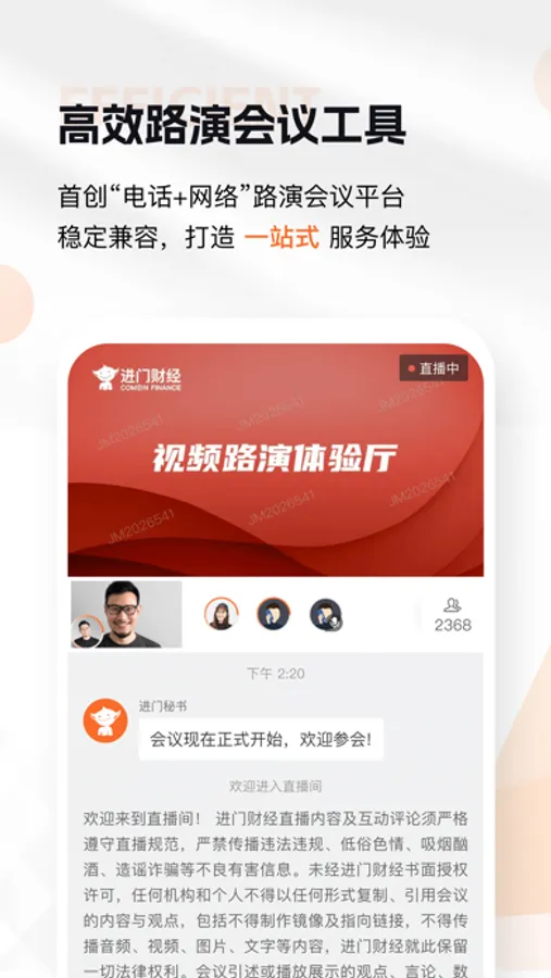 进门财经基于十多年对金融市场的服务和洞察,提供VOIP+PSTN音视频PPT同步通信解决方案,与腾讯会议和ZOOM互联互通,用户可多端接入。客户端支持进门财经APP,进门小程序,进门H5网页,进门PC端,腾讯会议和ZOOM。权限管控支持白名单,机构通,参会申请,公开,私密等多种模式。路演会议支持网络会议,电话会议和网络+电话双通道会议模式。