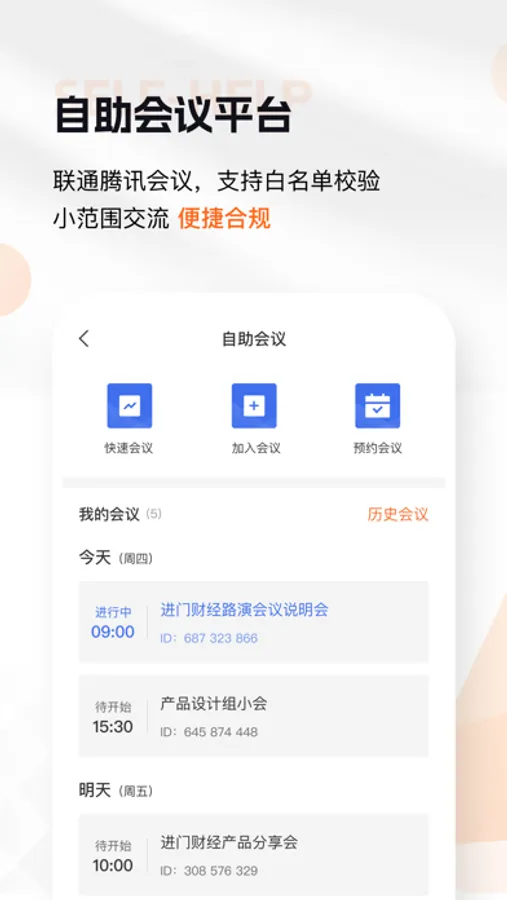 自助会议系统:与腾讯会议互联互通,白名单校验,小范围交流便捷合规