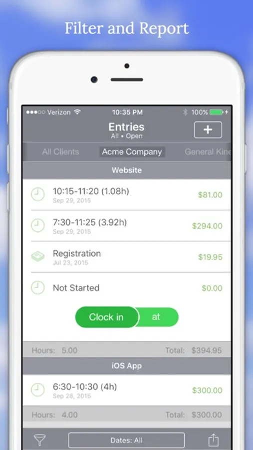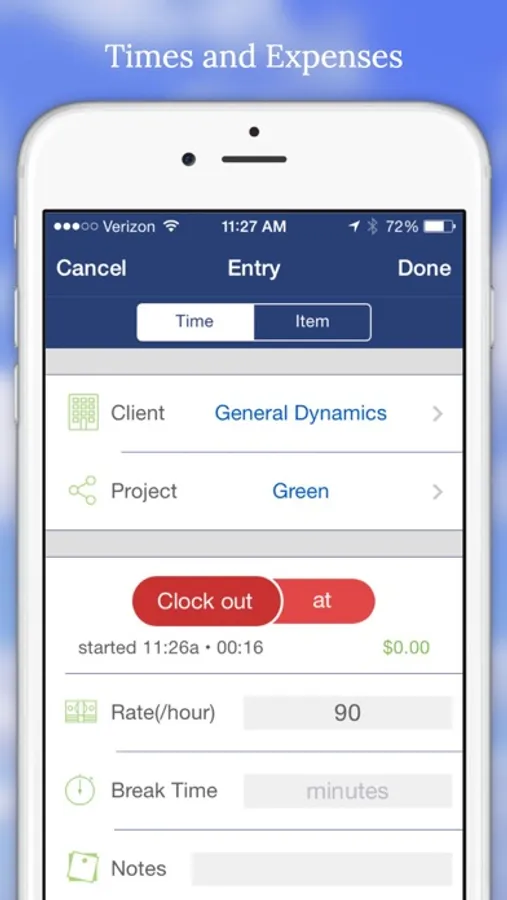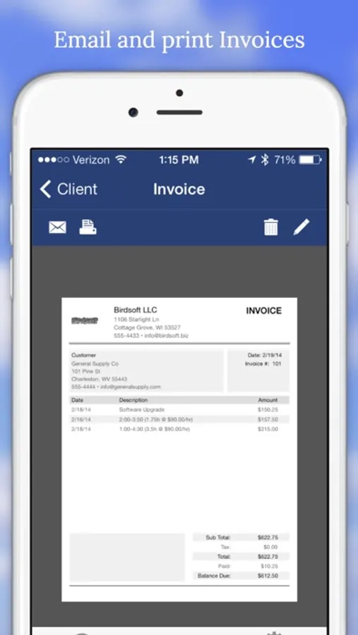 • Create a professional custom invoice based on your entries and quickly email or print it.