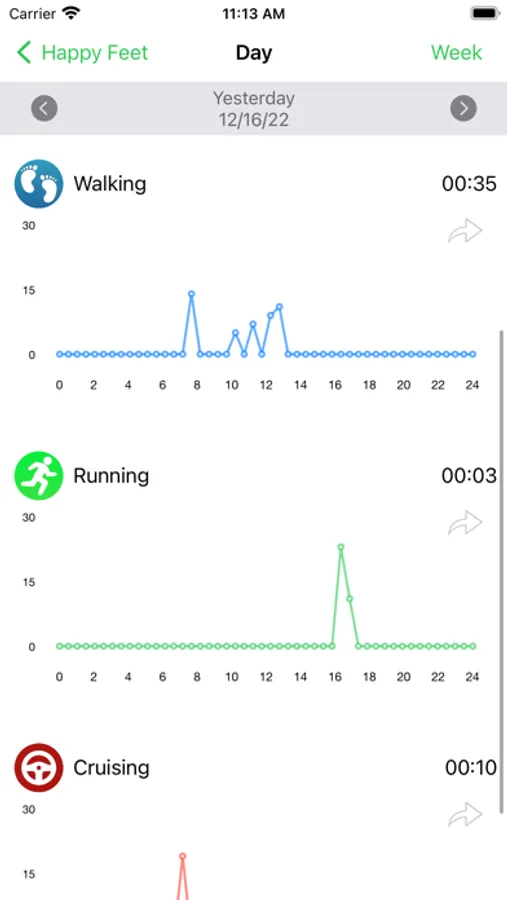 Happy Feet tracks your motion activity even when it is not running. It uses the device's internal motion co-processor for tracking. This means no extra power consumption.