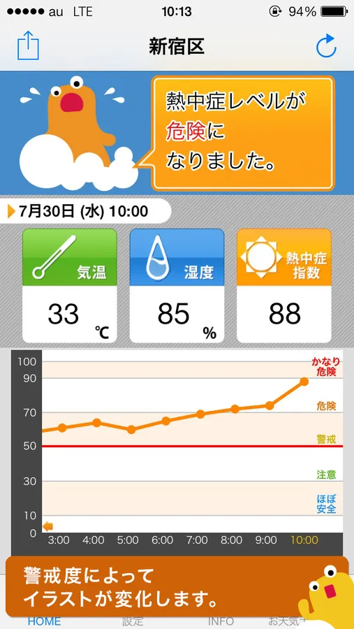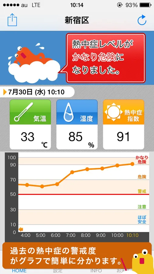 ・HOME画面では、現在の熱中症レベルに加え、過去24時間分の熱中症指数の推移も確認できます。
