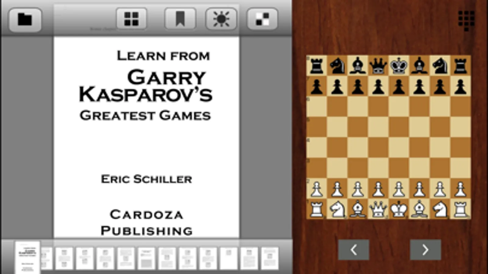* This app comes with a sample copy of "Bonus chapters from the book - Learn from Garry Kasparov’s Greatest Games" by FM Eric Schiller (http://ericschiller.com/)