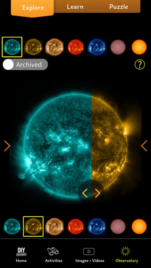 Want to see the Sun right now in different wavelengths? Use DIY Sun Science to view live images of the Sun from NASA’s SDO satellite in the Sun Observatory. Afterwards, you can learn more about the solar activity you observed and test your new knowledge.