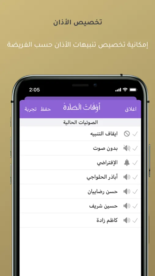 - المؤذن بشكل تلقائي غير مفعل يمكنك تفعيل المؤذن من شاشة الإعدادات ولكي يعمل الصوت حدد صوت المؤذن المفضل لديك.