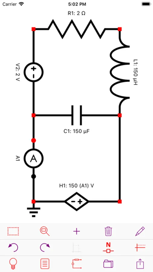 Build an AC or DC electrical circuit by adding, dragging and rotating components and then snapping them together. The steady state response is calculated instantly at the tap of a button. DC current flows can be animated on screen.