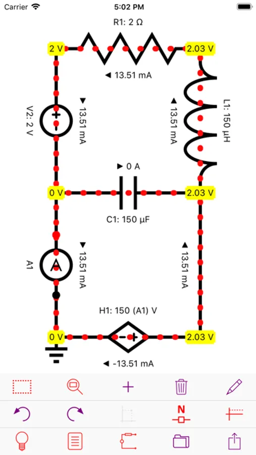 Zoom and pan around with standard gestures to view the voltages and currents which are displayed on the schematic.