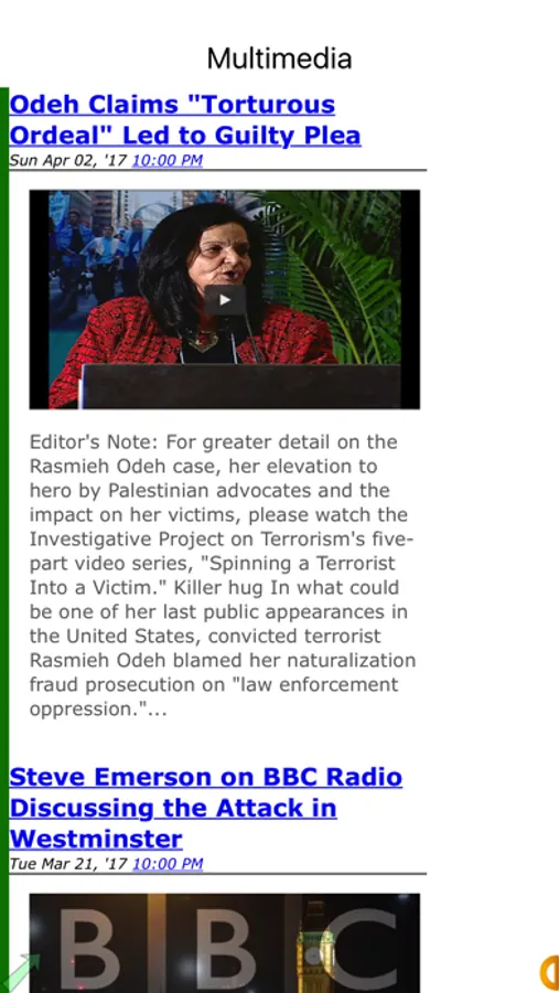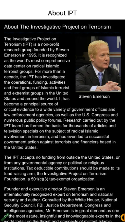The Investigative Project on Terrorism (IPT) is a non-profit research group founded by Steven Emerson in 1995. It is recognized as the world's most comprehensive data center on radical Islamic terrorist groups. For more than a decade, the IPT has investigated the operations, funding, activities and front groups of Islamic terrorist and extremist groups in the United States and around the world. It has become a principal source of critical evidence to a wide variety of government offices and law enforcement agencies, as well as the U.S. Congress and numerous public policy forums. Research carried out by the IPT team has formed the basis for thousands of articles and television specials on the subject of radical Islamic involvement in terrorism, and has even led to successful government action against terrorists and financiers based in the United States.