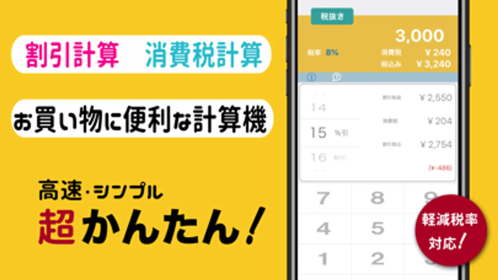 消費税率10%と軽減税率8%に対応した便利でカンタンな消費税計算・割引計算電卓です。