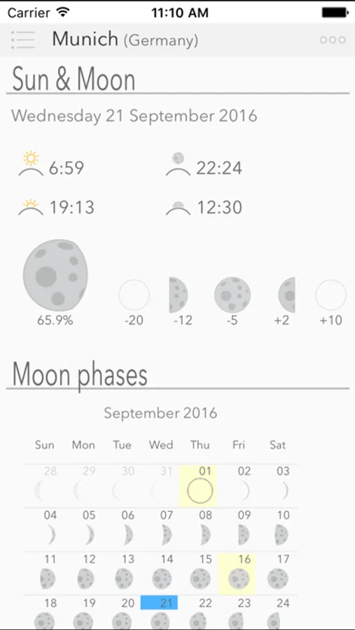 - Moon phases and moonrise/moonset times