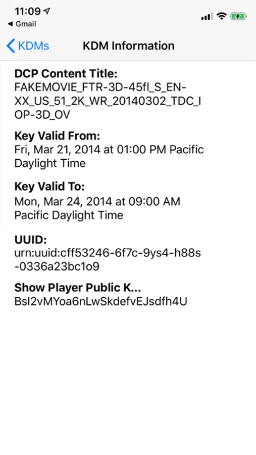 KDM Inspector is a useful utility app for projectionists, theater technicians, post production facilities, and anyone who works with Digital Cinema Packages (DCPs) and KDM encryption keys. KDM Inspector allows you to quickly open a KDM key that has been emailed to you right from your iOS device and immediately see useful information such as: Content Title, Key Active Time, Key Expiration Time, Show Player Public Key and UUID. KDM Inspector can open a key that has been emailed to you as a .xml file or multiple keys that have been emailed to you as a .zip file.