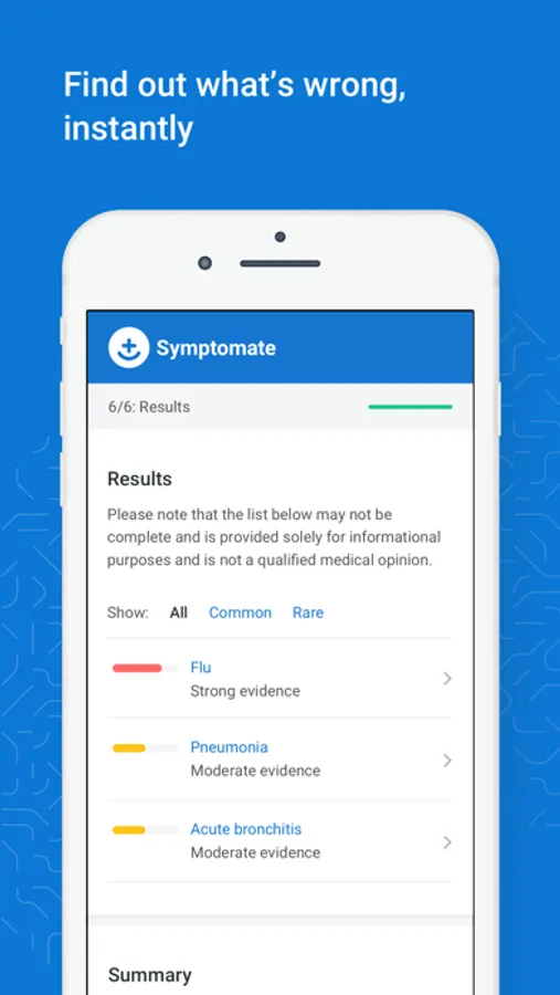 Symptomate is the most advanced symptom checker that uses artificial intelligence to evaluate your symptoms. Developed and validated by doctors, Symptomate knows more than 700 conditions and will help you to check your health status instantly.