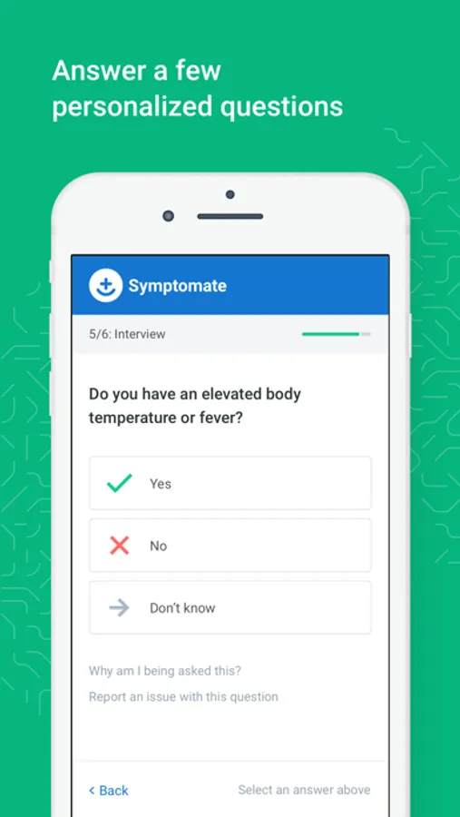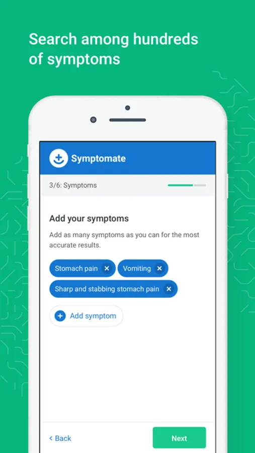 Symptomate will start looking for the cause of your symptoms. It will ask you a few carefully selected follow-up questions.