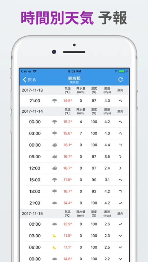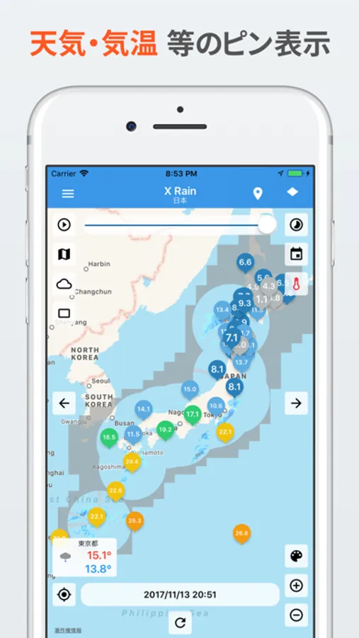 ・天候、気温、気圧、降水量、湿度、風向きを地図上に表示