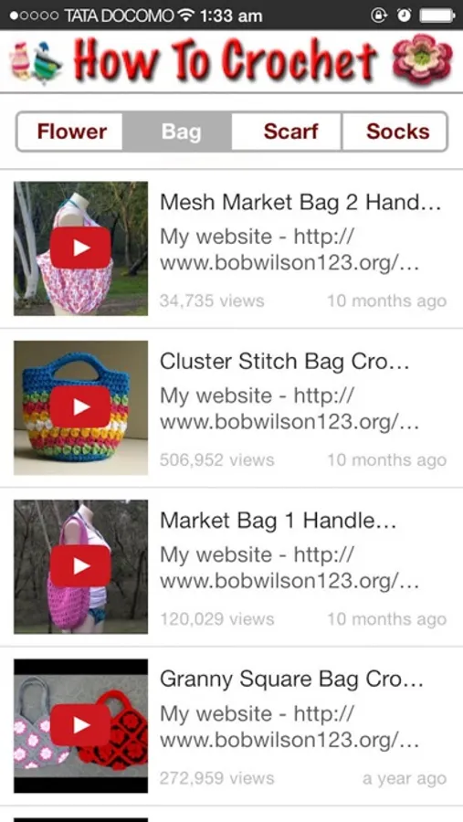 - Wearable Crochet: This interesting section have tons of video, to make wearable Crochet, like Flower, Bags, Scarfs, Socks etc.