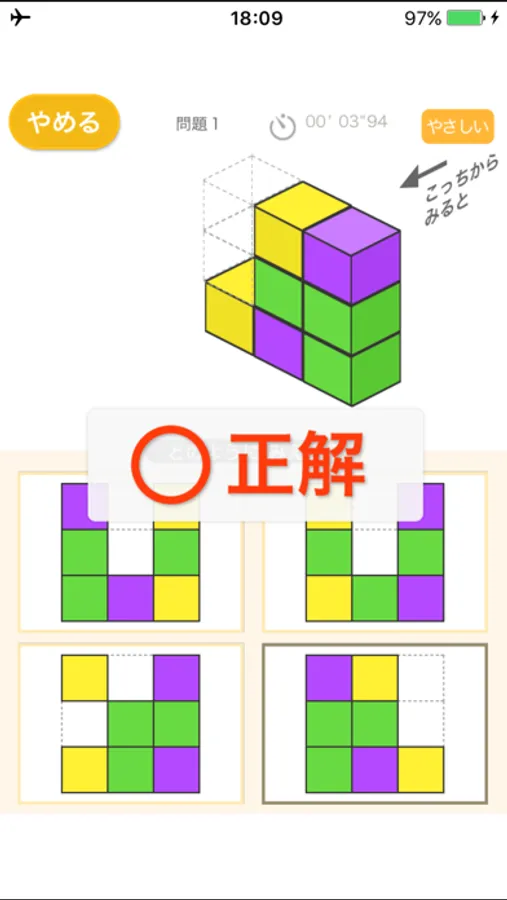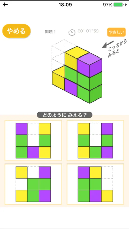 ブロックを矢印のほうから見たとき、色がどのように見えるかを当てるアプリです。