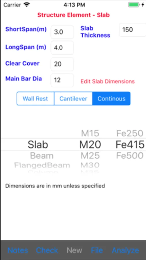 A typical home screen as shown in screen shot has a element picker with related default dimensions. Users can select any element with grade of concrete and steel used and dimensions as per the given application for analysis. App uses only SI system of units for all data input and output.