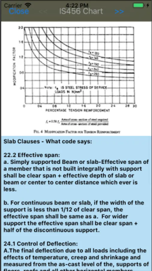 Complete document of IS456 is made freely available at Bureau of Indian standards for the benefit of public at large. A few important tables and figures that are relevant to the given element analysis is presented in this app for convenience. The review screen has a scroll-able text view as well as image view and navigation buttons are provided to switch between images.