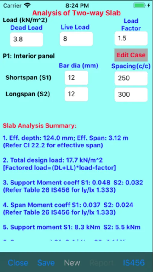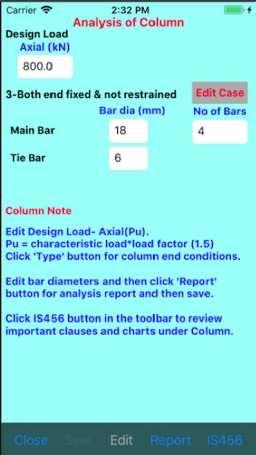 The analysis screen will also have certain default data pertaining to the load and reinforcement bars. Users can edit these data based on the actual application and measurement. This is to make sure all the data entered are correct. Once entered report is presented in a scroll-able text view as shown in the screen shots.