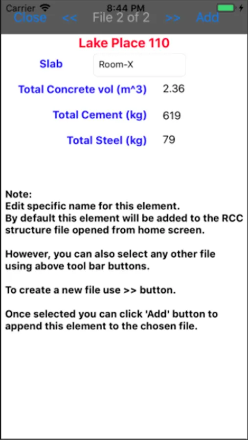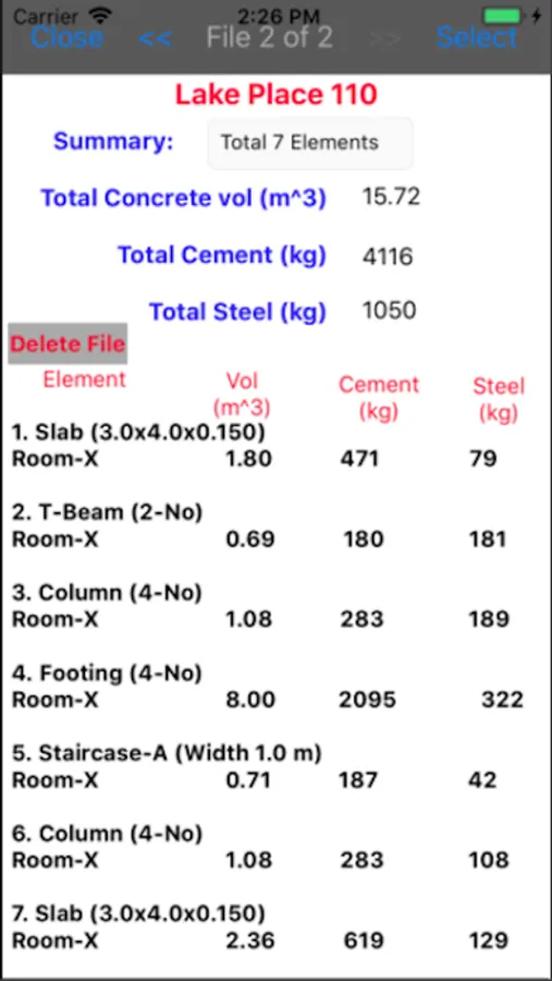 A RCC structure may have many different elements such as footing, column, beam, slab etc. Therefore each structure can be saved with unique title where one can add as many elements to this structure with reference name or code number for identification. A file summary is also provided that gives total structure summary along with individual element material summary as shown in the screen shots.