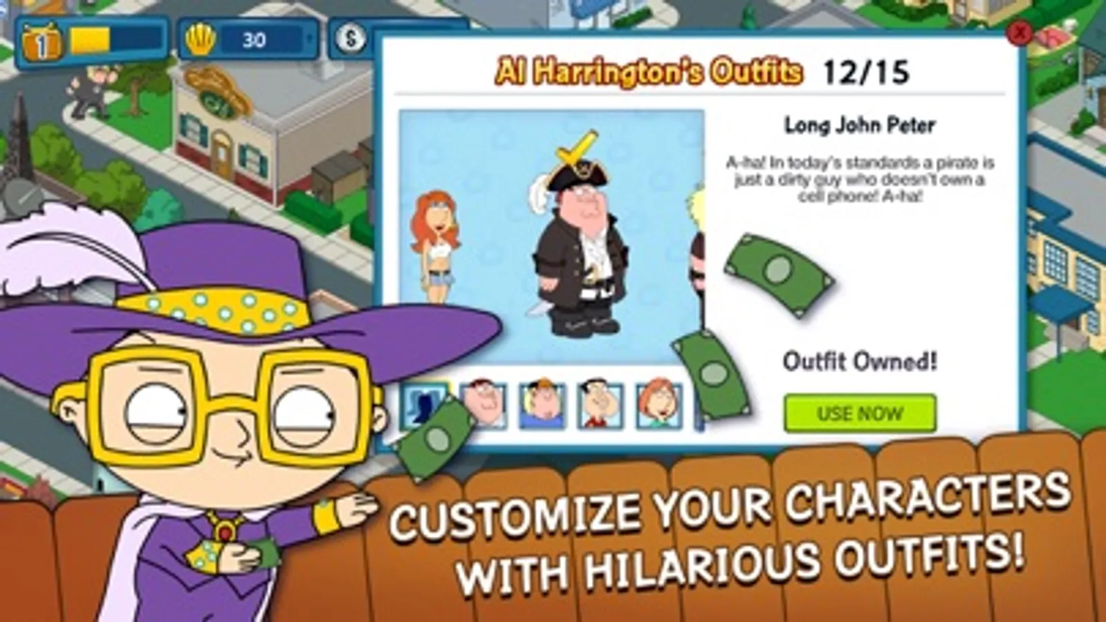 • Unlock hilarious outfits for your characters like Mermaid Peter, Bikini-Clad Quagmire, and Rambo Lois