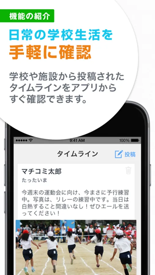 マチコミアプリでは学校・施設からの連絡をすぐに受信し確認できます。
