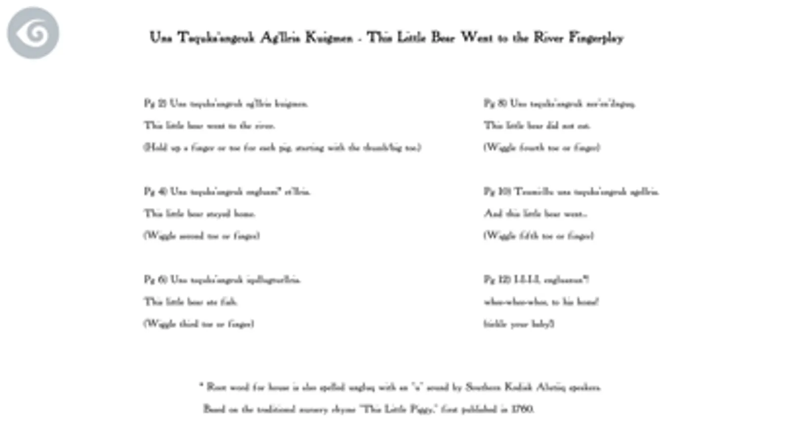 Una Taquka'angcuk Ag'llria Kuigmen is based on the traditional nursery rhyme "This Little Piggy" first published in 1760.