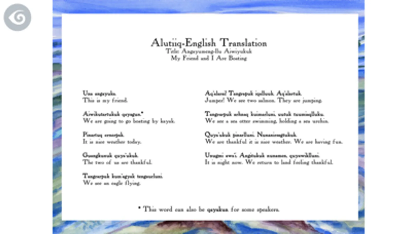 Angayumeng-llu Aiwiyukuk is an original book inspired by a song written in 2012 at the Dig Afognak Music Camp, Afognak Island.