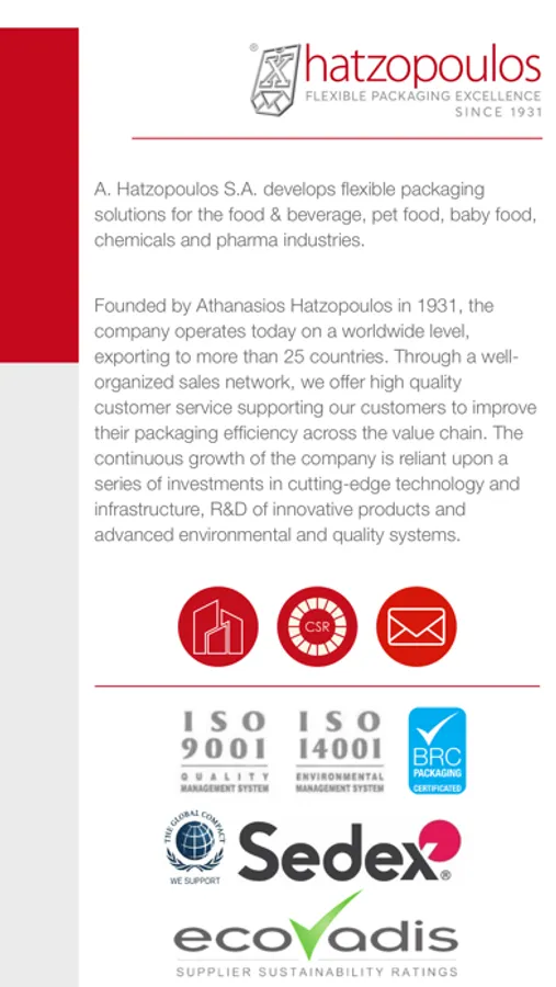 Since 1931, A. Hatzopoulos SA specializes in flexible packaging converting, exporting its products to more than 25 countries through a well-organized sales network and a multilingual and high quality customer service team.