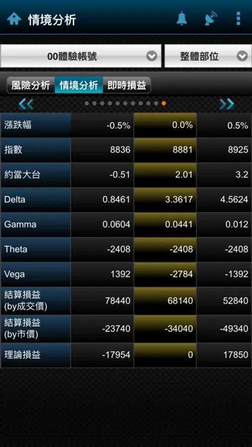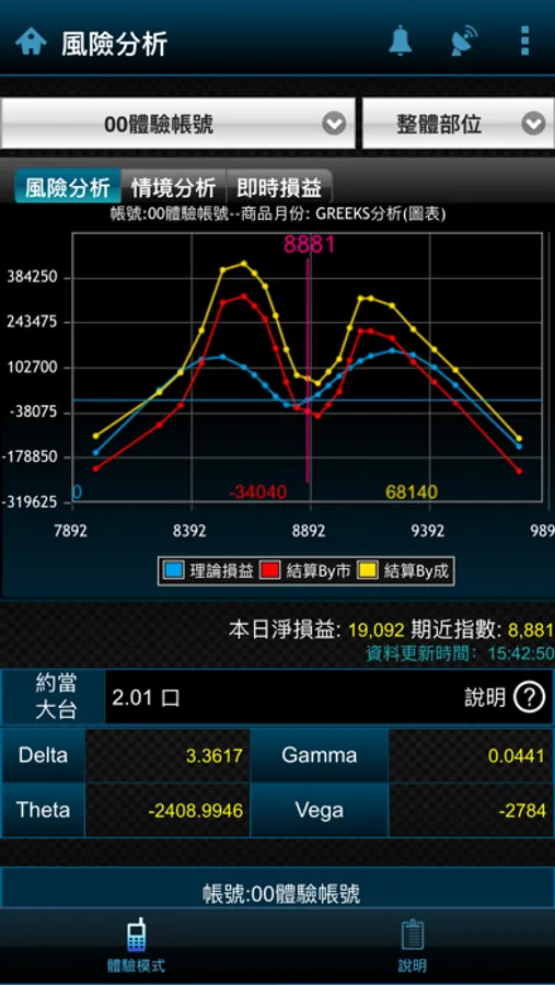 1. 雲端即時運算期權整體部位,提供損益圖與風險值(Greeks)分析