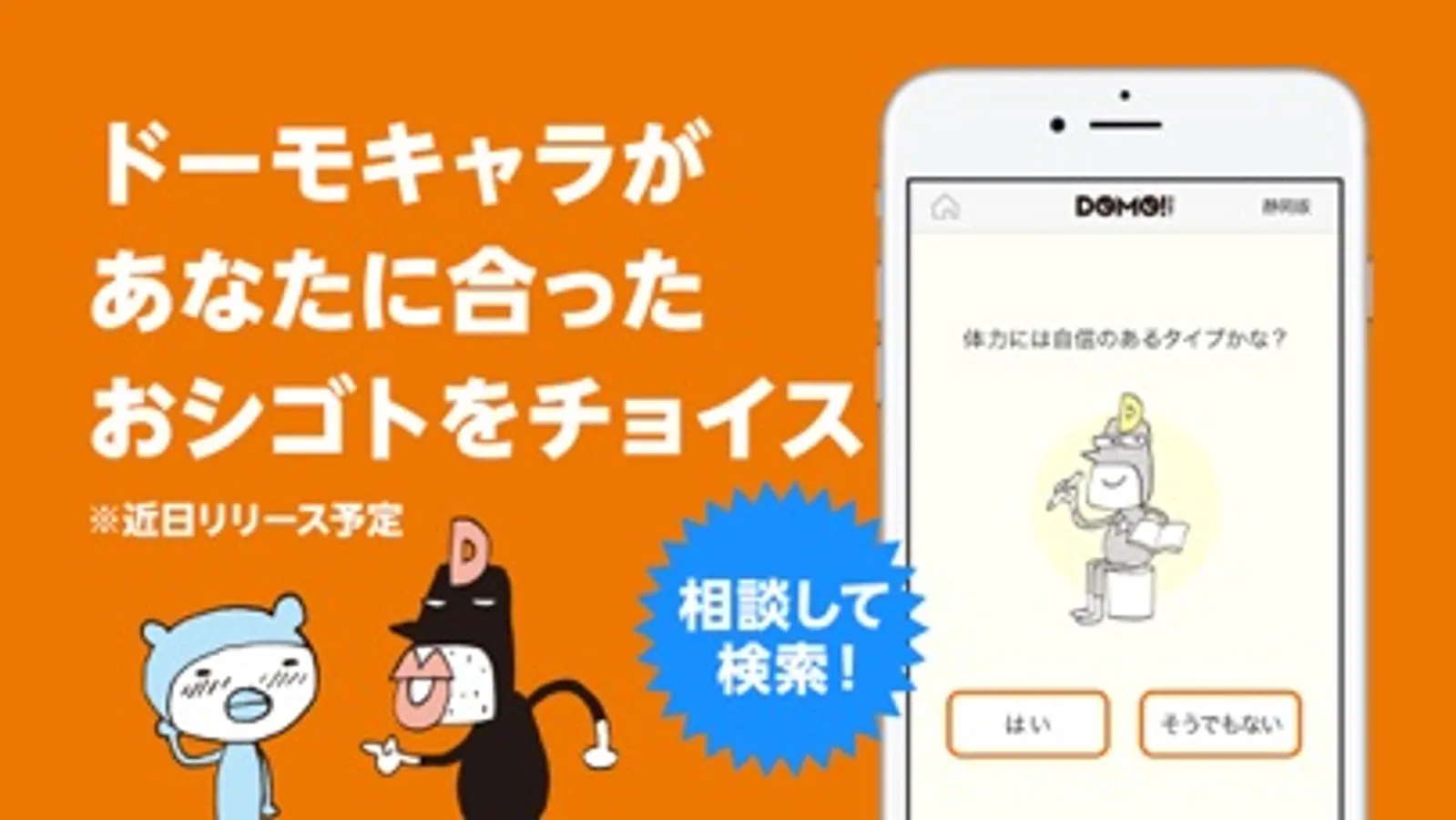 - おなじみのドーモキャラクターが、あなたにぴったりの求人情報を紹介する相談機能も追加(こちらも次期バージョンで実装予定)