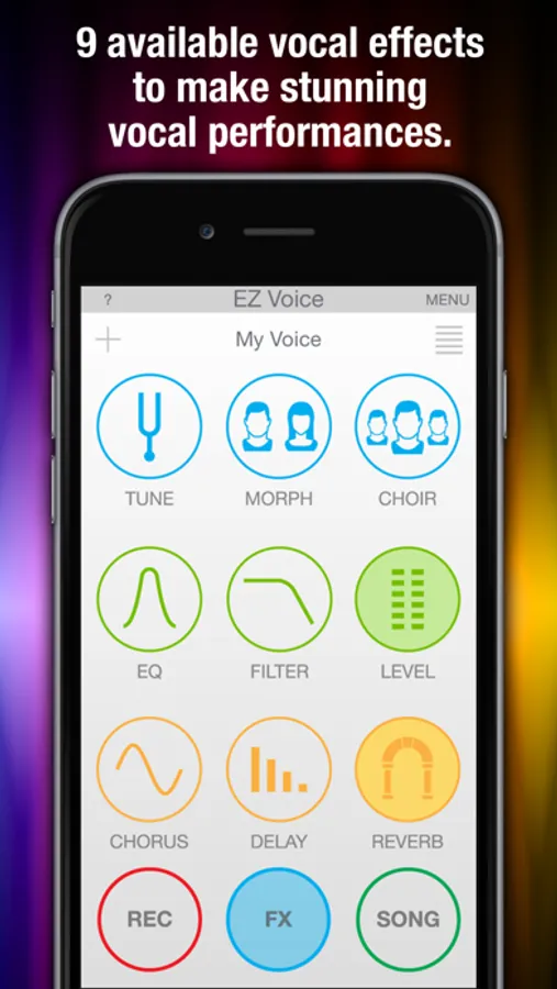 EZ Voice lets you have fun while you perfect your tone. You can select up to 3 simultaneous audio effects of its 9 included high-quality effects: Use Tune to keep your voice in key like the pros; add Morph to try a different gender; apply Choir to add extra voices and harmonies; or try more traditional effects like Reverb, Delay, Chorus, EQ, Filter, and Level — all derived from IK Multimedia's award-winning professional audio software. One tap adds an effect, two taps lets you edit. Save your favorite combinations and settings to the preset library.