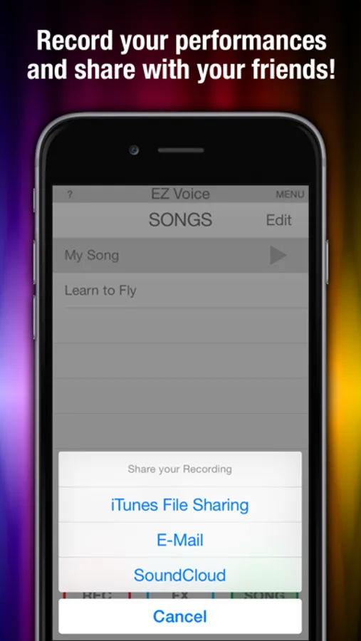 Quickly manage your saved performances with the SONG menu. EZ Voice does all the organizing for you, letting you compare, evaluate and modify your previously recorded takes with ease — you can even duplicate songs to take full-advantage of EZ Voice's many vocal effects. Save your work, and when you're satisfied, share your performances with your friends and fans via email or SoundCloud.