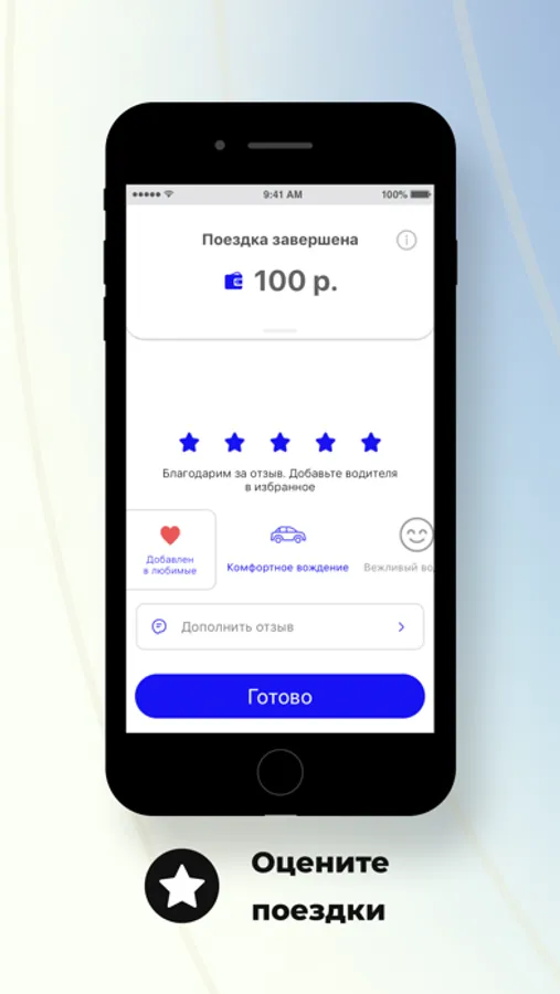Поставьте оценку водителю, напишите отзыв или выберите реакцию из готовых шаблонов. Прикрепите фотографию к отзыву, оставьте чаевые или посмотрите детализацию платежей после поездки.