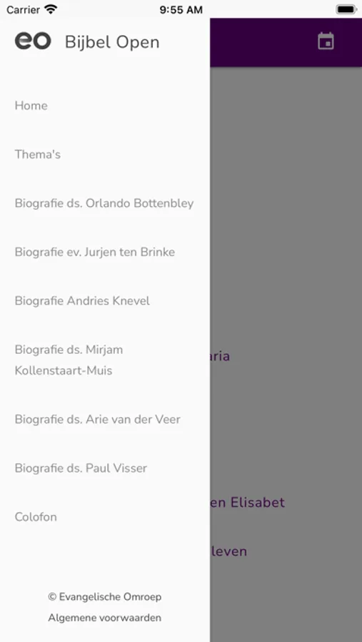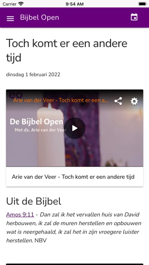 Iedere dag biedt de EO Bijbel Open app video-meditaties van verschillende sprekers, een korte overdenking uit een Bijbels dagboek en een prachtig lied van Nederland Zingt. Deze app is een gemakkelijke manier om een samen te komen rond een open Bijbel. EO Bijbel Open app is onderdeel van EO Nederland Zingt.