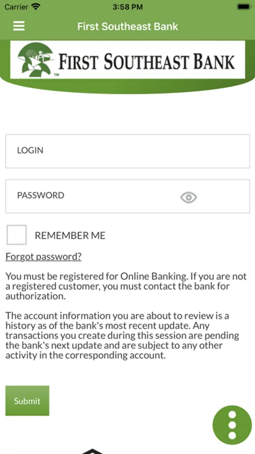 This app is for First Southeast Bank customers. First Southeast Bank does not charge a fee for Mobile Banking. Connectivity and usage rates may apply. Contact your wireless service provider for more details.