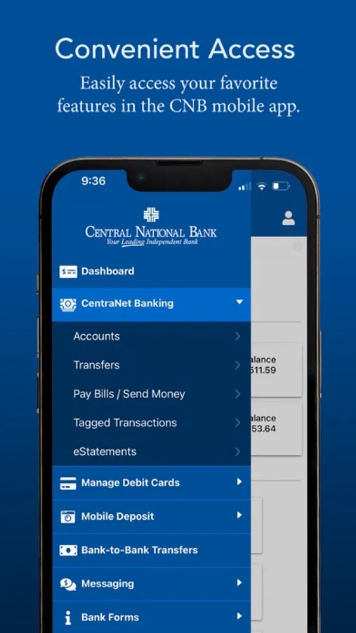 Central National Bank’s mobile banking app provides secure, real-time access to your accounts. You can check your balances, view transactions, pay bills, and transfer money with just a touch. To use the CNB mobile app, simply log in using your existing CentraNet ID and password.