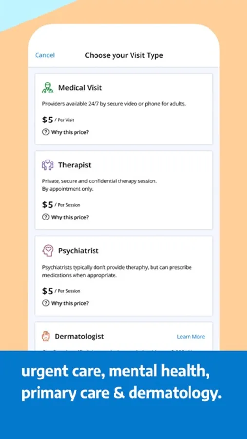 MDLIVE also offers behavioral health appointments with licensed therapists and board-certified psychiatrists as well as dermatology services.