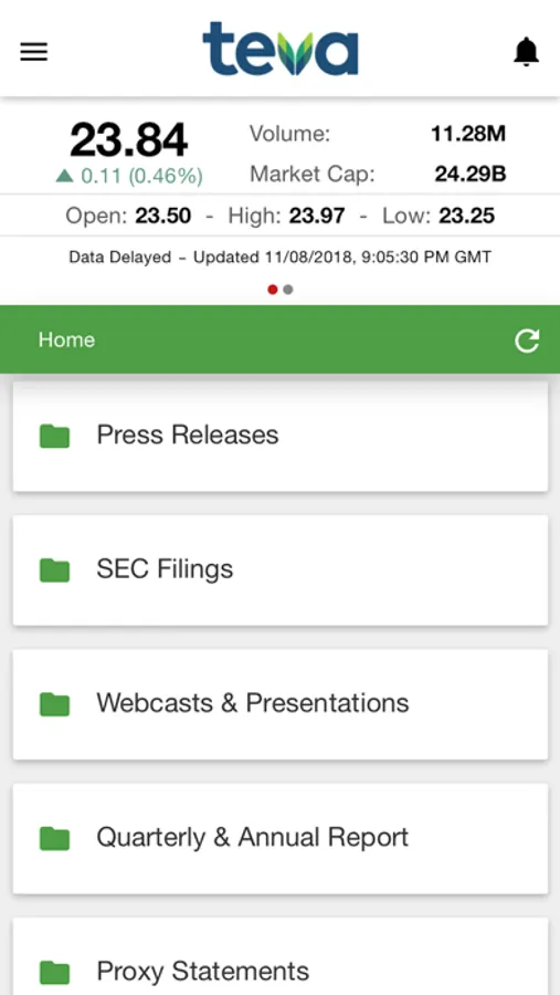 This app gives Teva Pharmaceutical Industries (NYSE: TEVA) investors mobile access to the latest stock data, news, SEC Filings from Teva Pharmaceutical Industries, as well as proprietary company content including presentations, conference calls, videos, sales and marketing collateral, fact sheets, annual reports and other qualitative company information. Investors are able to receive push notifications when new content is added to theIRapp; add events to their calendars, share content as well as download it for offline viewing.