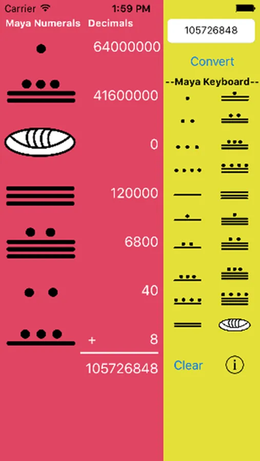 This app simultaneously displays user generated Maya numbers and their equivalent decimal values at each place value, as well as the final decimal equivalencies for Maya numbers 1 to 1,279,999,999.