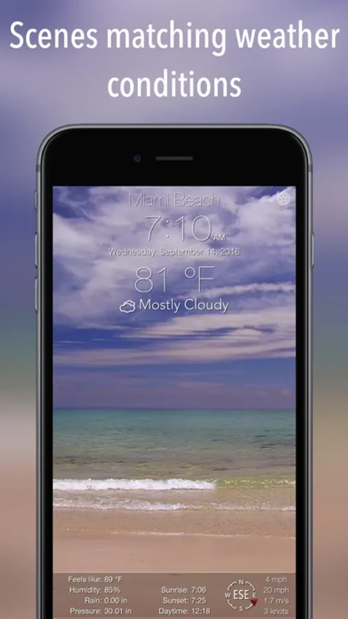 + Sleek screen displaying current weather conditions with matching real animated weather backgrounds