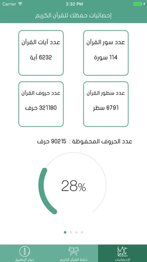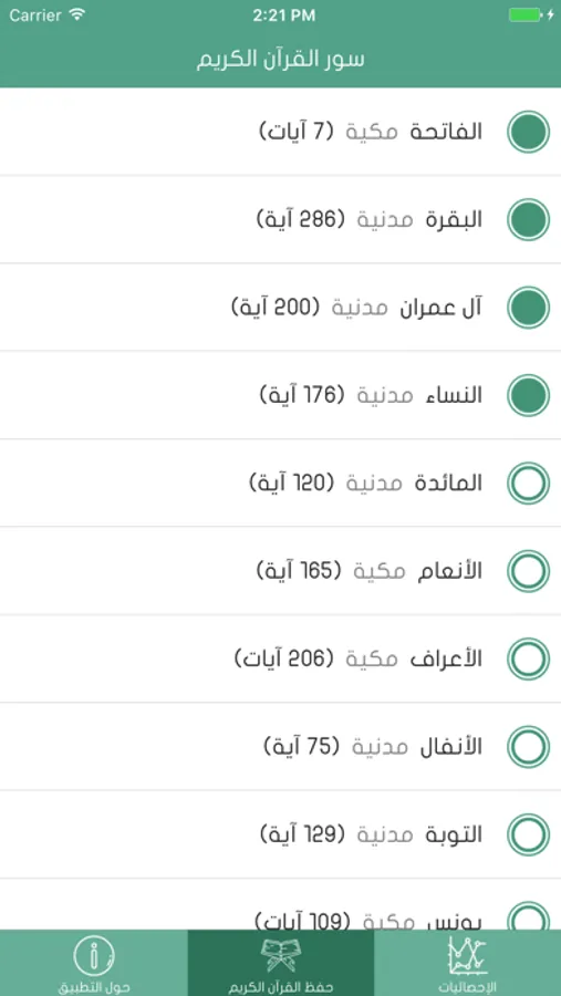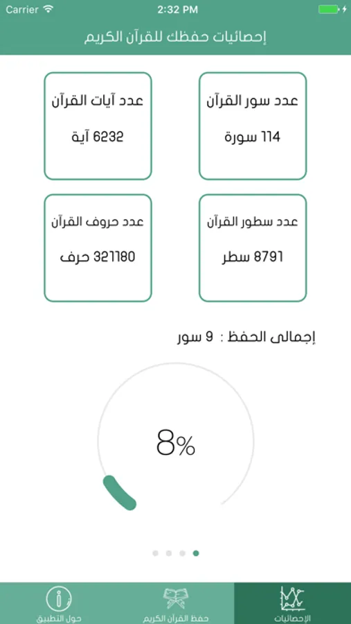 في هذا التطبيق يمكنك تحديد السور التي تحفظها من القرآن الكريم، ويقوم التطبيق بتحديد نسبة حفظك للقرآن اعتمادا على عدة معايير