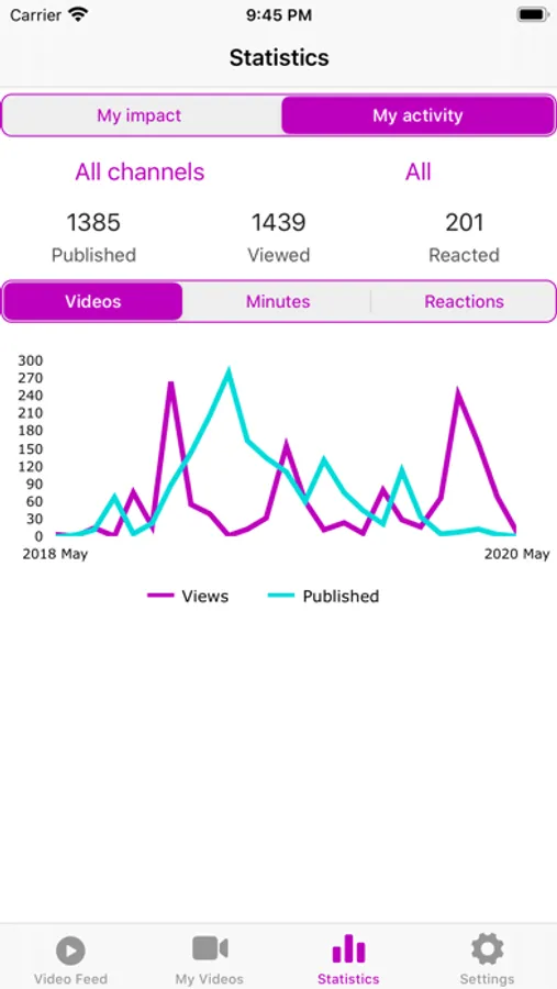 • See personal video statistics: number of views and reactions for your videos, your activities related to creating and watching videos