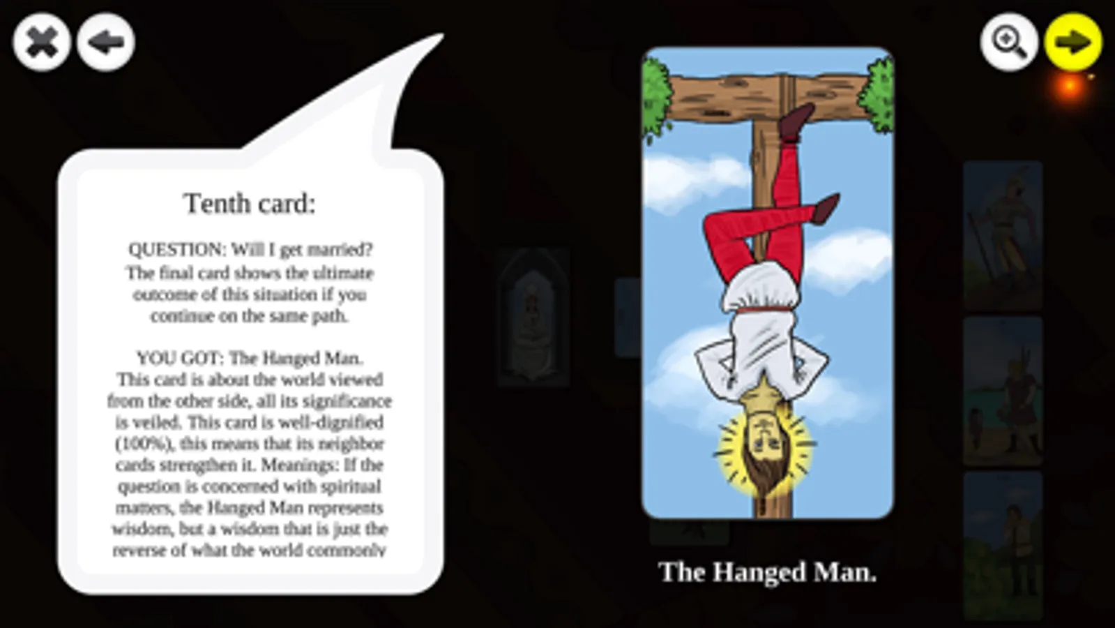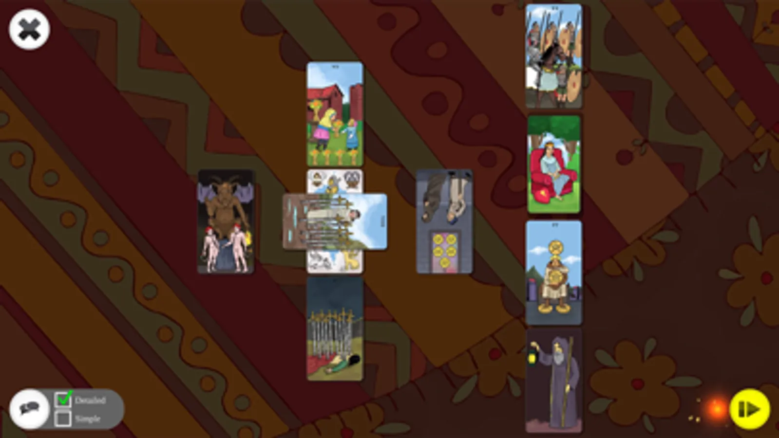 This game contains 4 different spreads depending on your situation: Celtic cross spread, three cards spread, romance / love spread and career spread. It can give you a detailed explanation for advanced users or a simple one for beginners. The game is translated in 8 languages and all results can be sent in your email. It contains 5 full decks of cards. The main one is our own custom made, animated deck and 4 historic Marseilles decks: Grimaud 1930, Conver 1760, Dodal 1715 and Noblet 1650. You can have your own reading which can be saved in 10 slots or a multiplayer in your living room to compare your results with your friends.