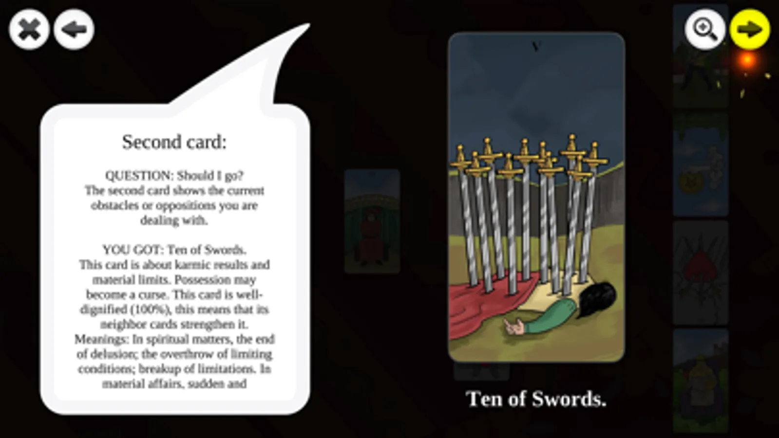 The tarot reading is a pack of playing cards used in parallel for divination in the form of tarotology and cartomancy. With our game you can have the full taro experience! It makes you feel like you are visiting a real gypsy tarot reader. She will shuffle the cards, let you choose them and then present them and explain their meanings. This is the most beautiful and fully animated Tarot card experience out there. The main deck style used is gorgeous and custom made. 4K resolution, made exclusively for us in 2019. All 78 cards are animated!