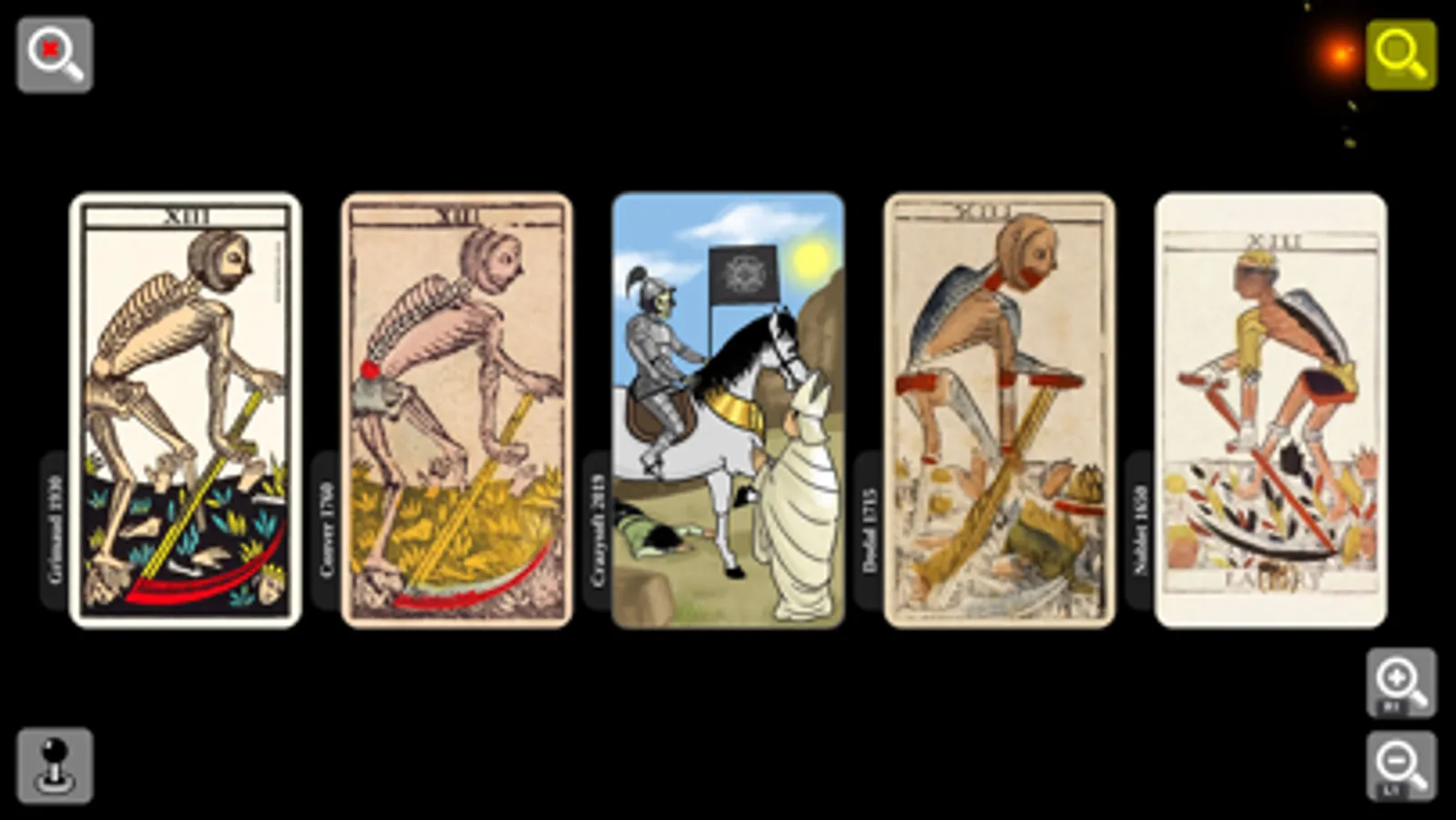 2) 5 full decks of 78 cards. (1 animated and 4 historic: Grimaud, Conver, Dodal, Noblet)
