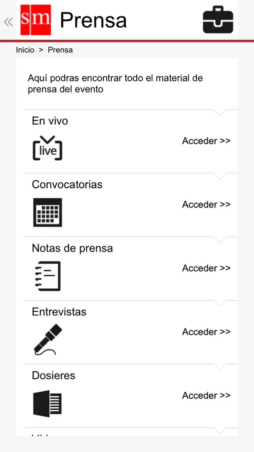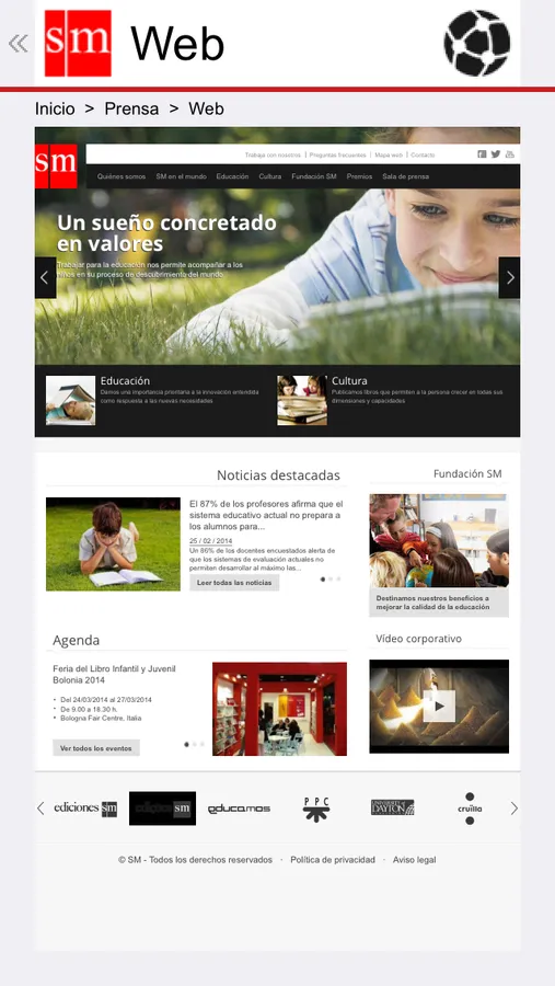 Aplicación de SM que da acceso a toda la información (convocatorias, notas de prensa, imágenes, vídeos…) relacionada con los eventos que organiza la editorial (entregas de premios, firmas de autores, presentaciones de libros, etc.).