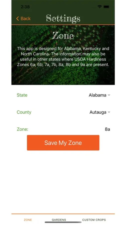 The Alabama Cooperative Extension System, University of Kentucky, and North Carolina A&T State University Extension have partnered to provide crop and planting information for growing zones 6a, 6b, 7a, 7b, 8a, 8b, and 9a. If you would like to see your state/zone in this app, contact Alabama Extension at acesapp@auburn.edu.