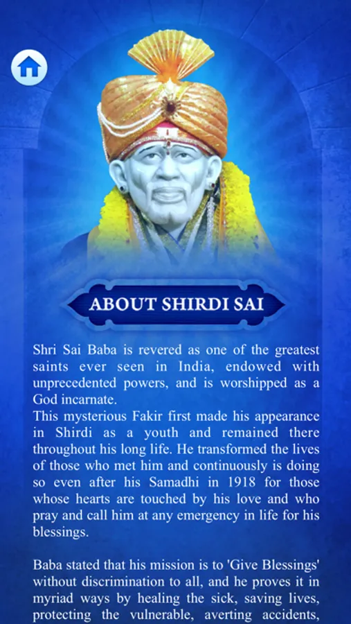 This mysterious Fakir first made his appearance in Shirdi as a youth and remained there throughout his long life. HE transformed the lives of those who met him and continuously is doing so even after his Samadhi in 1918 for those whose hearts are touched by his love and who pray and call him at any emergency in life for his blessings.