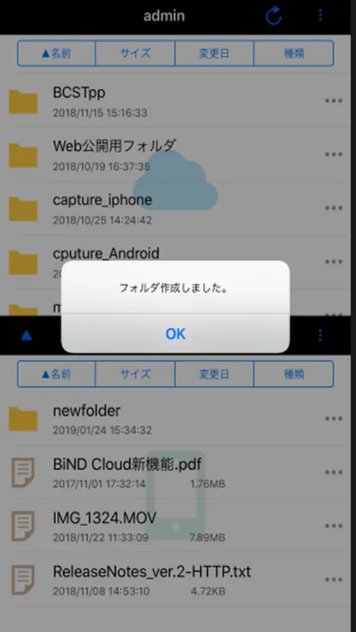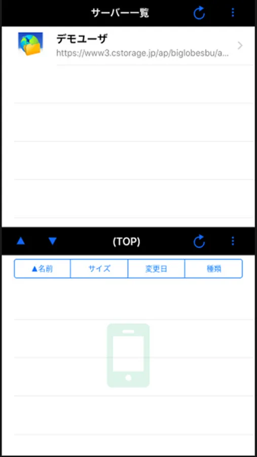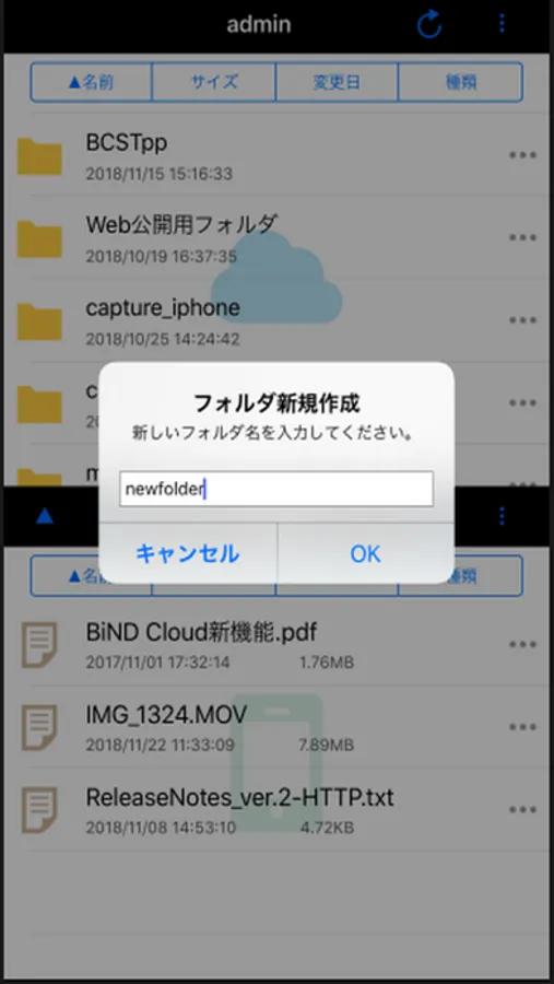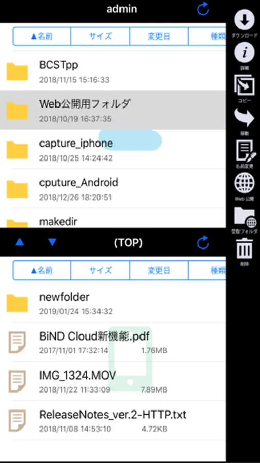 ファイル名、サイズ、変更日、ファイルの種類でソートすることができ、モバイル端末からも簡単にファイル操作できます。